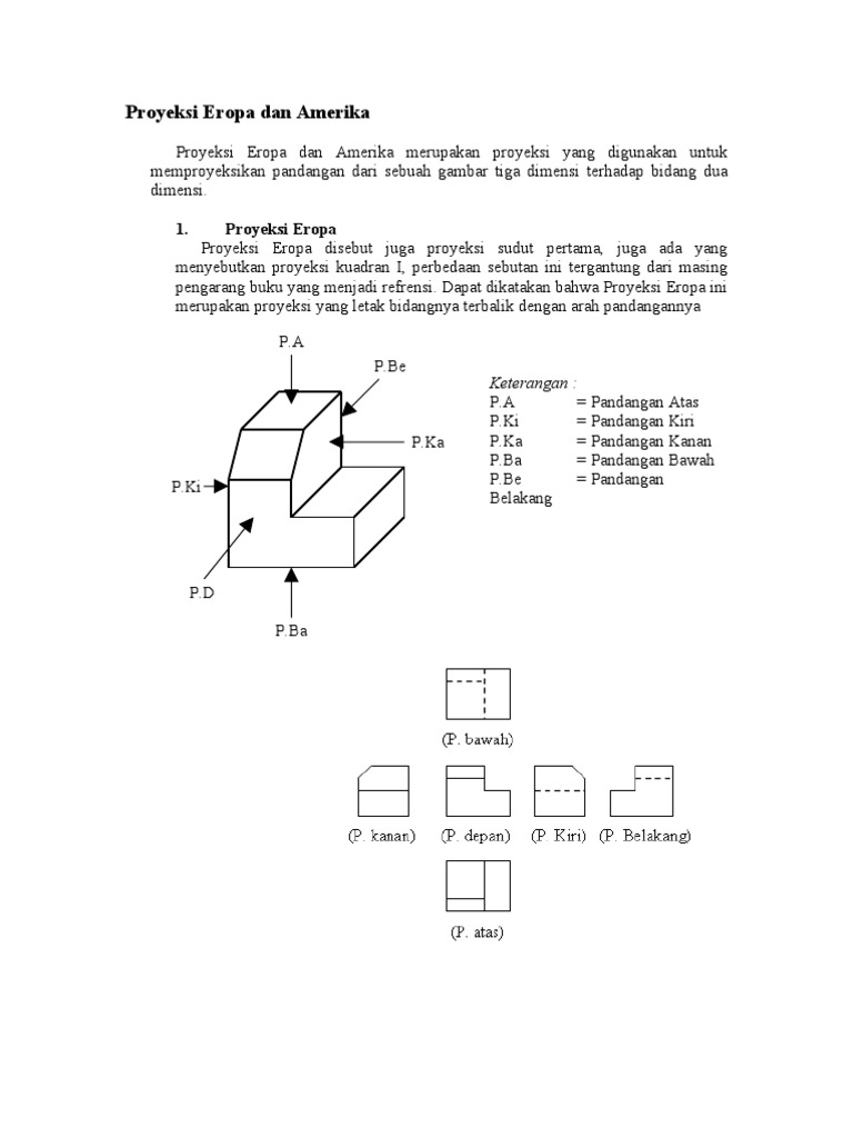 Proyeksi Amerika disebut sebagai proyeksi kuadran ketiga karena pandangan utamanya diletakan di kuadran ketiga. Gambar teknik mempunyai beberapa macam proyeksi yaitu kecuali. Contoh proyeksi Eropa 2.